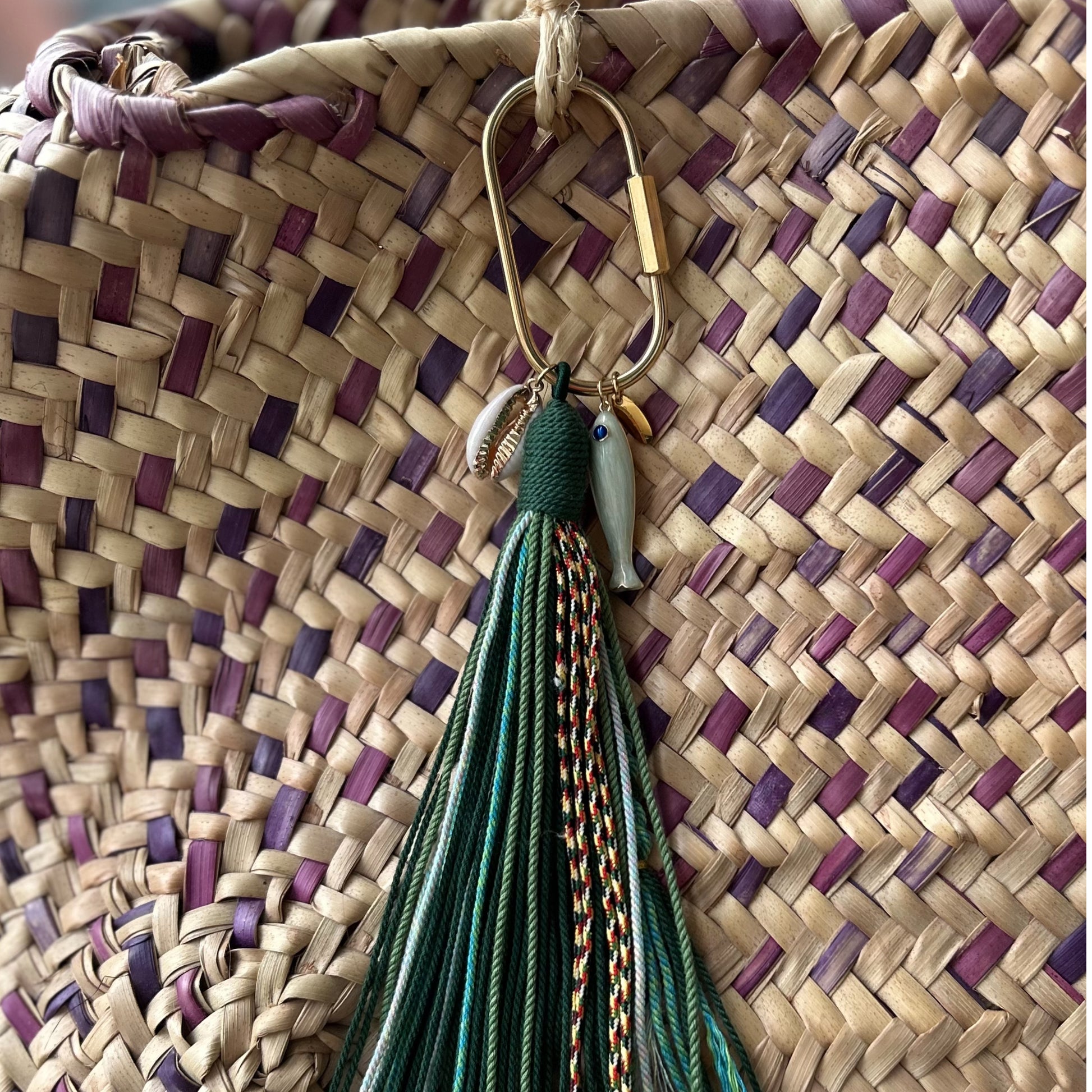 Bring a touch of vibrant, coastal-inspired elegance to your favourite tote or handbag. The Calypso Bag Charm features rich green tones accented with playful pops of color and gold hardware, including a delicate cowrie shell and fish charm. Perfect for adding a bold, spirited detail to your everyday look or beachside getaway.